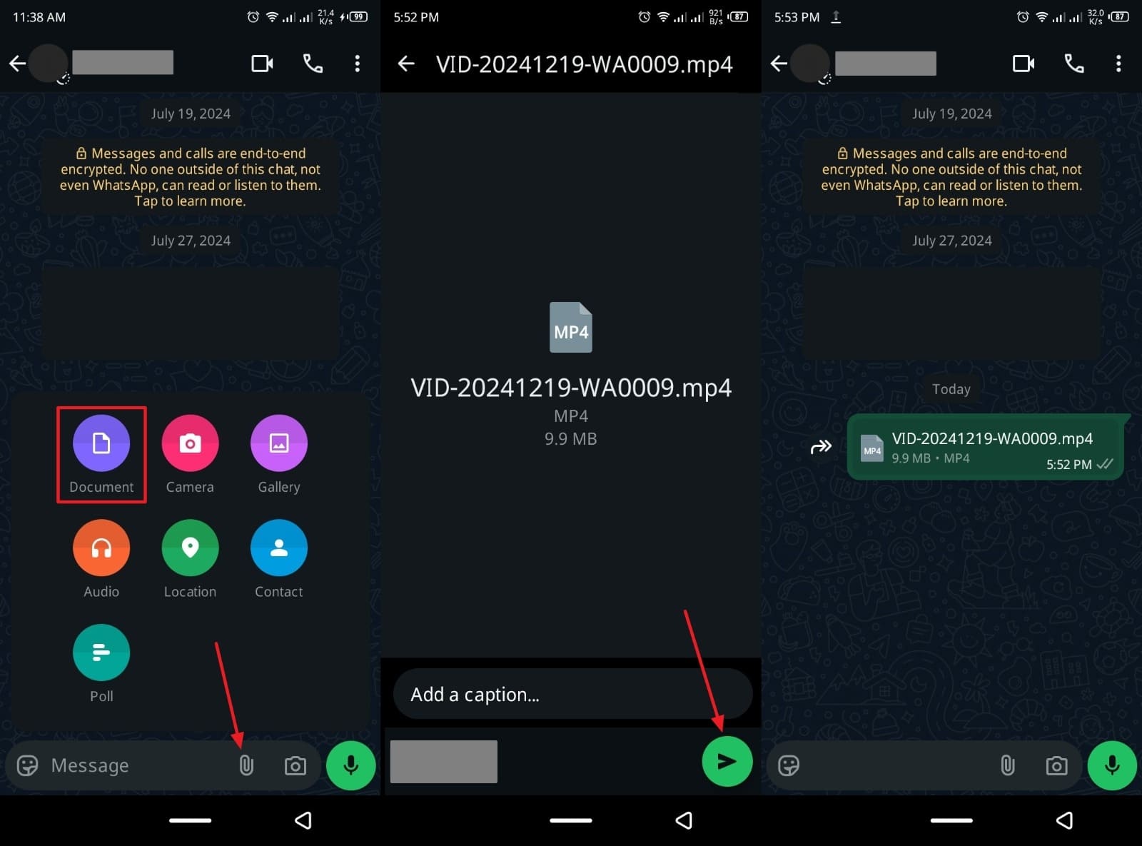 指示:在 Android 移动设备上打开 WhatsApp 聊天,然后从“附件”的自下而上菜单中选择“文档”选项。之后,从图库中选择所需的视频,然后点击“发送”将视频作为文档发送给您的朋友。