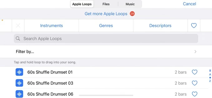 - 导入静音音频:点击砖图标进入轨迹视图。然后点击循环图标添加无声音轨。选择音频音乐选项卡或文件>从“文件”应用程序浏览项目。按下并将其拖至轨迹视图。根据需要将其修剪为不超过 30 秒。