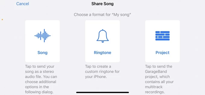 5.导出为铃声。完成后,点击向下箭头图标并选择我的歌曲。长按您的新文件>分享>铃声。然后为您的铃声命名并点击出口。