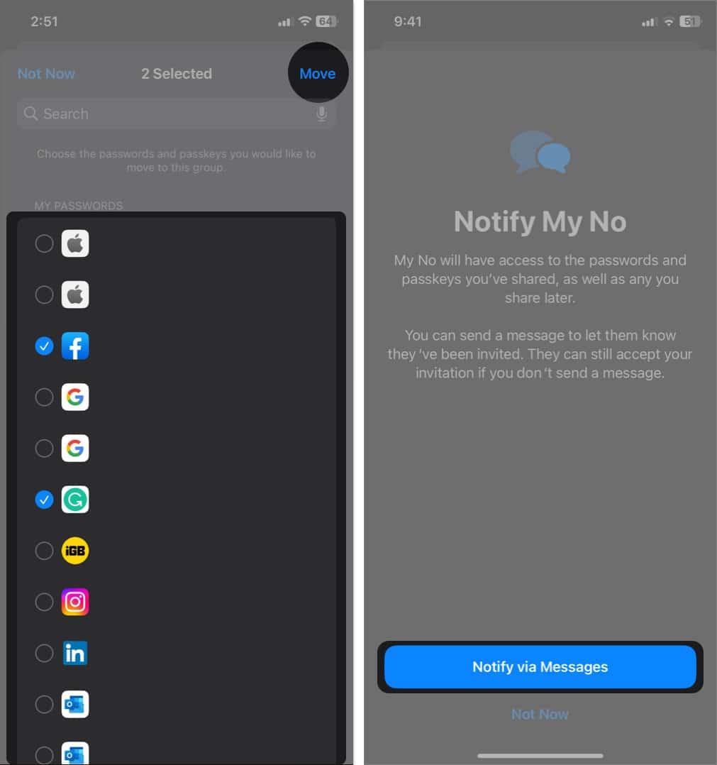8.选择您想要共享的已保存密码或密钥。点击移动将它们添加到组中。