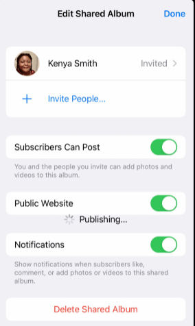 - 通过点击“+”图标、命名相册并添加收件人,在 Apple 照片应用程序中创建“共享相册”。