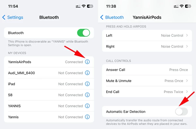 - 关闭自动耳朵检测以避免在您耳中检测到 AirPods 后音乐应用程序触发音乐播放。