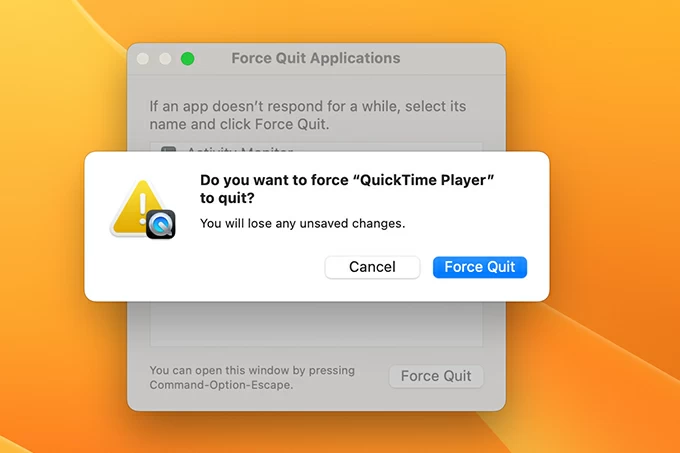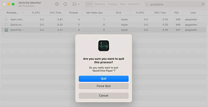 - 如果您从活动监视器终止 QuickTime Player,应用程序将关闭并且录制将停止。这也意味着您将丢失录音,因为它不会被保存。