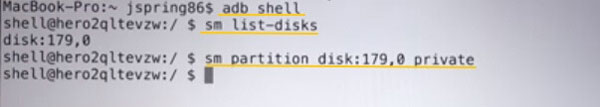 – 现在您需要对磁盘进行分区。如果你想完全采用SD卡作为内存,你可以输入“sm分区磁盘:179:160私有”。如果您只想采用卡的一部分,例如 50%,您可以输入“盘:179:160混合50”。