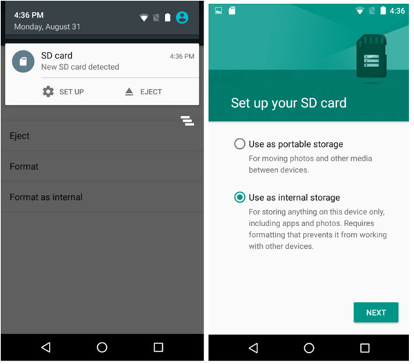 – 接下来,设备将为您提供两个选项:用作便携式存储和用作内部存储。只需选择后者并单击下一个。