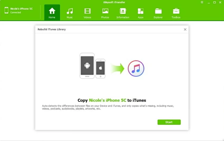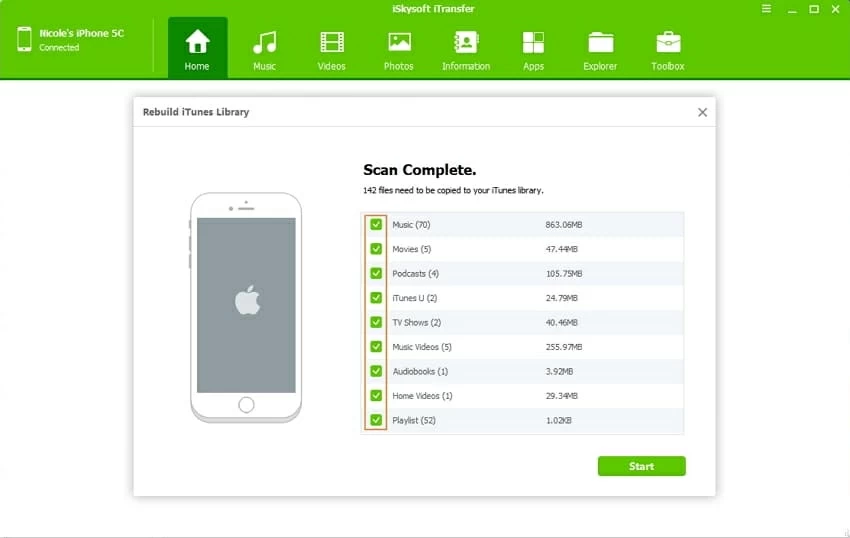 扫描完成后,您将看到一个弹出窗口,您可以在其中检查音乐选项或您想要从 iPhone 移动到 iTunes 的其他类型的文件,然后单击开始按钮确认您的选择。