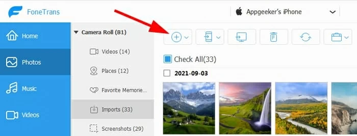 要传输本文中的文件、照片,请单击顶部的“+”图标。将弹出本地文件夹窗口。在此窗口中,选择所需的照片,然后单击“打开”按钮开始将文件从 PC 传输到 iPhone 的过程。