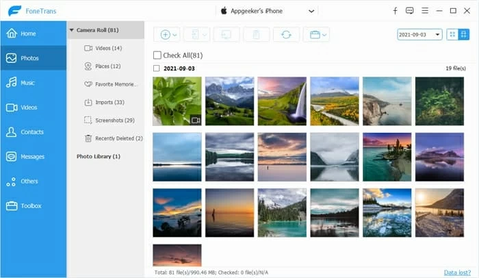 例如,单击“照片”选项卡,iPhone Data Transfer 将在窗口中加载 iPhone 中的所有照片。