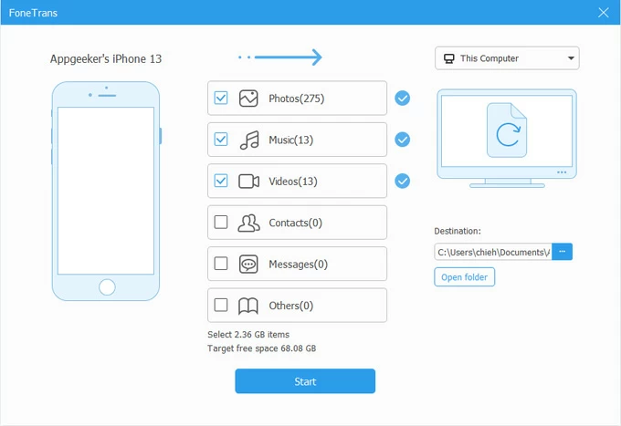 通过简单的点击,以下是如何将 iPhone 照片传输到 Windows 10,无需 iCloud 或 iTunes,支持所有 iOS 版本和型号: