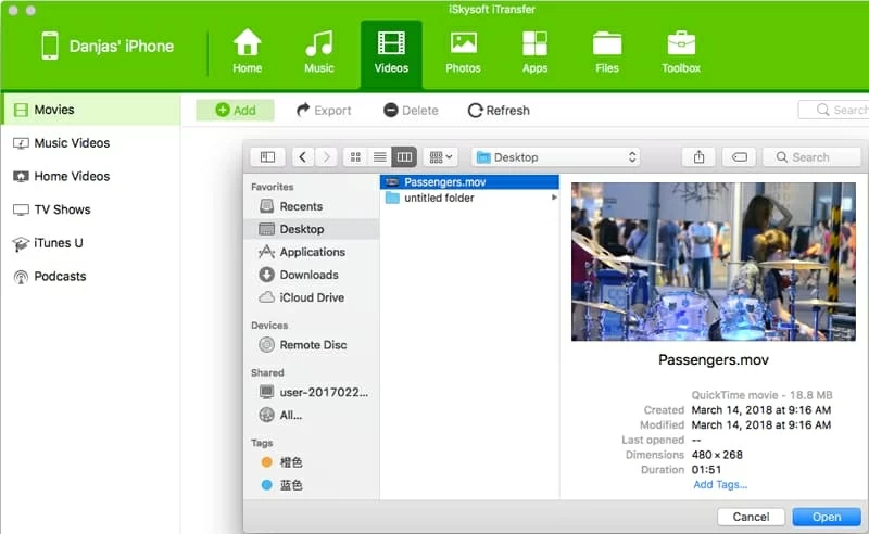 点击视频上方导航栏的选项卡,点击下方的添加按钮打开浏览窗口。从那里,导航到要复制到 iPhone 的视频,选择它,然后单击蓝色打开按钮。