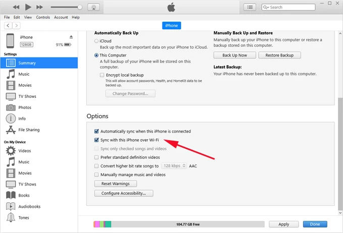 免费将音乐从 iPod 传输到 iTunes 的传统方法是使用 iTunes 本身的内置数据传输功能。但是,如上所述,只有 iPod 上的购买内容才能同步到 iTunes 资料库。除此之外,您还需要使用 iPod 上的同一 Apple ID 来授权计算机。