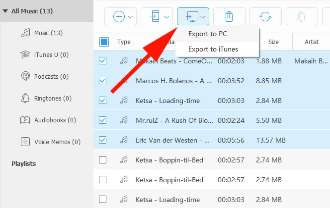 从 iPod Touch 中选择音乐后,单击顶部工具栏中的电脑图标,然后从下拉菜单中选择“导出到 iTunes”。