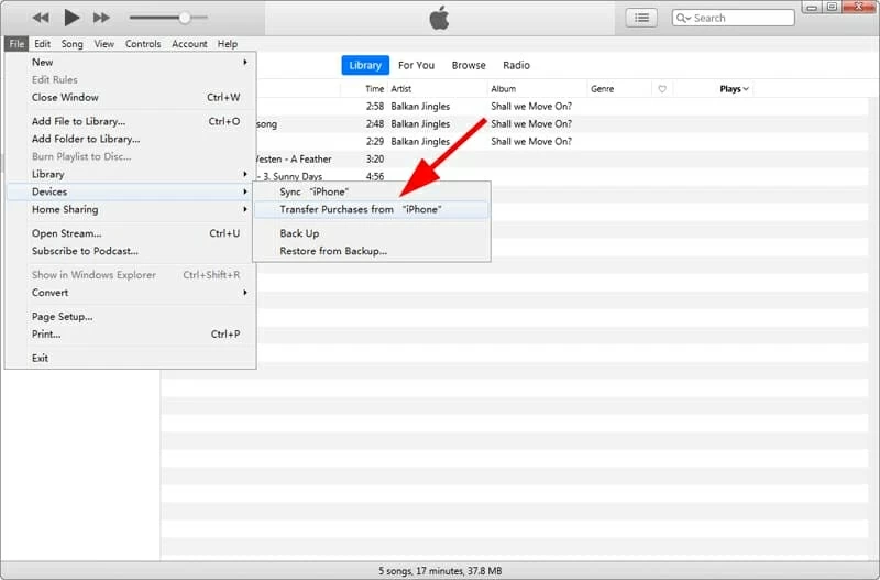 2. 转到 iTunes 窗口顶部的菜单栏,然后转到“文件”>“设备”。