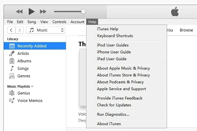将 iPod 音乐与 iTunes 同步后,它们将列在音乐库中以供离线收听。将歌曲从 iPod 传输到 iTunes 的过程非常简单。确保您使用的是最新版本的 iTunes。要检查这一点,请打开 iTunes,转到顶部菜单栏的“帮助”选项卡。然后点击列表中的“检查更新”按钮。