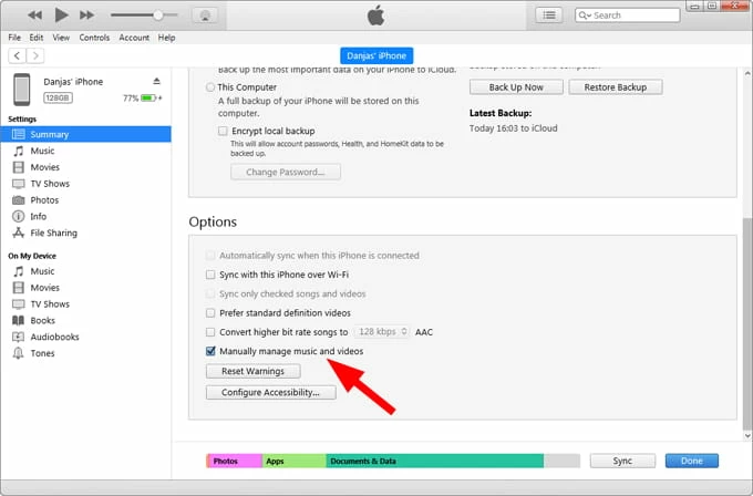 或者,您可以手动从 iTunes 移动歌曲。单击后设备图标在 iTunes 中,转至概括设置,滚动找到手动管理音乐和视频选项,选中它,然后单击申请。