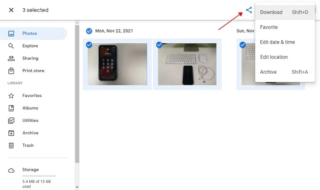 与 iCloud 照片类似,Google 照片提供 15 GB 的免费云存储空间,让您可以跨设备在线备份和同步 iPhone 17 照片。只需将照片从 iPhone 上传到 Google 相册,然后从任何联网的浏览器将它们下载到您的计算机即可: