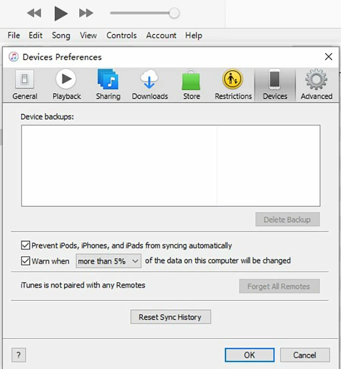 首先确保在 iTunes 中选中“阻止 iPod、iPhone 和 iPad 自动同步”选项,方法是转至“编辑 > 首选项 > 设备 > 选中阻止 iPod、iPhone 和 iPad 自动同步”。