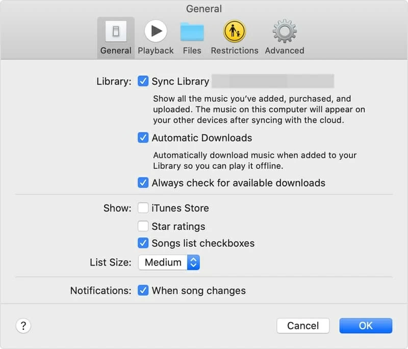 注意:在 macOS Mojave 或更早版本中,该过程在 iTunes 中进行,只不过该选项称为“iCloud 音乐库”而不是“同步库”。