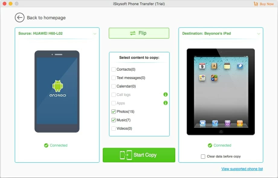 此外,该程序还为您提供了“复制前清除数据”选项,可在开始从旧 Google 手机传输歌曲和其他内容之前擦除 iPad 中的数据。