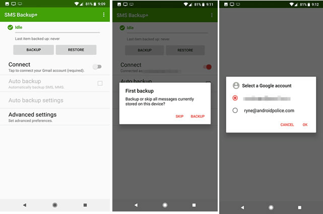 - 接下来,从 Google Play 商店安装 SMS Backup+ 应用程序。安装后,点击“连接”并选择您要用于备份文本的 Gmail 帐户。