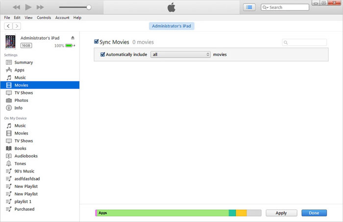 步骤3。在左侧栏中选择“电影”标签。然后,选中“同步电影”的框,然后选择要转移到iPad的电影。之后,您可以单击右下方的“应用”按钮。