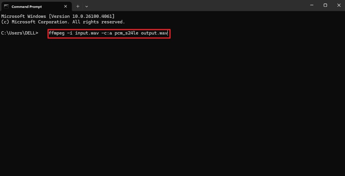 步骤2然后,启动命令提示符并输入“ffmpeg -i input.wav -c:a pcm_s24le output.wav”。在这里,将“input.wav”替换为损坏文件的原始名称,然后按“Enter”键完成该过程。