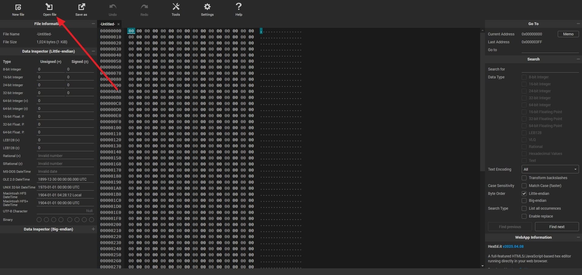 步骤1您需要打开任何在线十六进制编辑器,例如六角形。在浏览器中,使用“打开文件”按钮导入工作 WAV 文件。