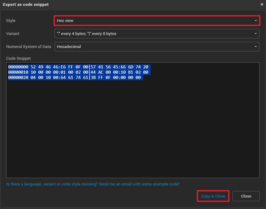 步骤3在“导出为代码片段”窗口中,确保“样式”为“十六进制视图”,然后单击“复制并关闭”按钮。接下来,在编辑器中打开损坏的 WAV 文件,并用复制的数据替换其前 47 个字节。保存文件并再次播放以查看音频是否正常。
