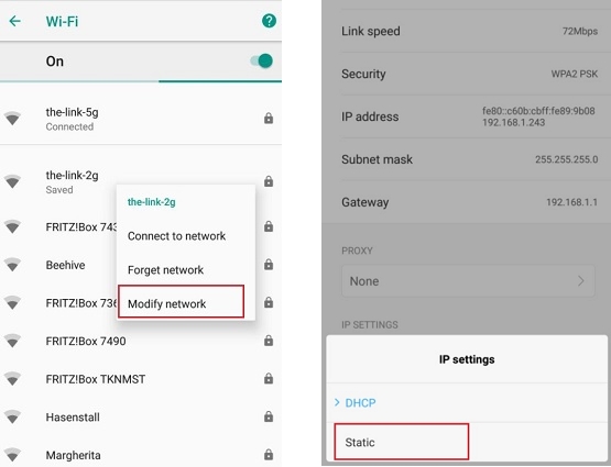 如果您无法进行身份验证,您可以尝试强制 Android 手机使用静态 IP 地址,而不是在连接时动态选择 IP 地址。