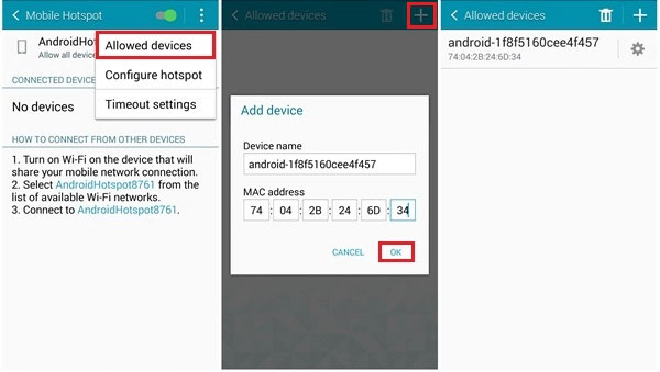 点击菜单按钮并选择允许的设备从列出的选项中。然后您可以单击“+”图标输入设备名称和设备的 MAC 地址。之后,您可以单击好的添加设备。您可以添加的允许设备数量最多为 10 个。这些连接的设备将能够通过您的移动网络访问互联网。