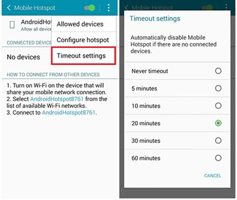 导航至菜单>超时设置打开超时设置,包括永不超时、5分钟、10分钟等。此时如果有连接的设备,WLAN热点将自动禁用。