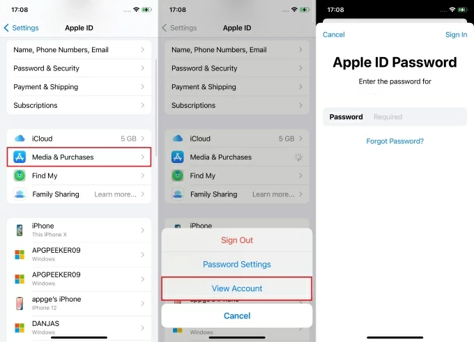3。在弹出窗口中,选择查看帐户并输入您的Apple ID密码。