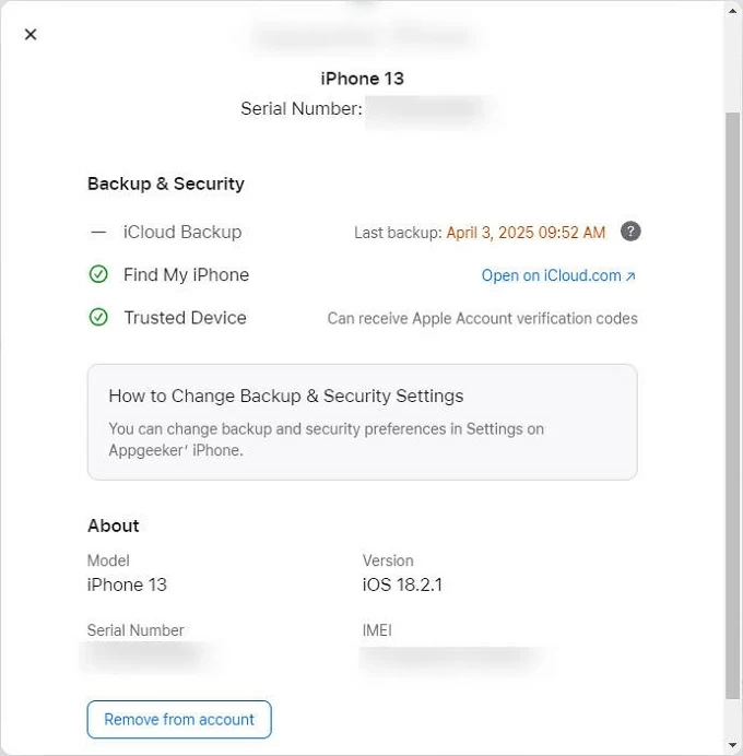 4。选择卸下此设备选项并单击消除要切断对主要iPhone iCloud帐户的访问。