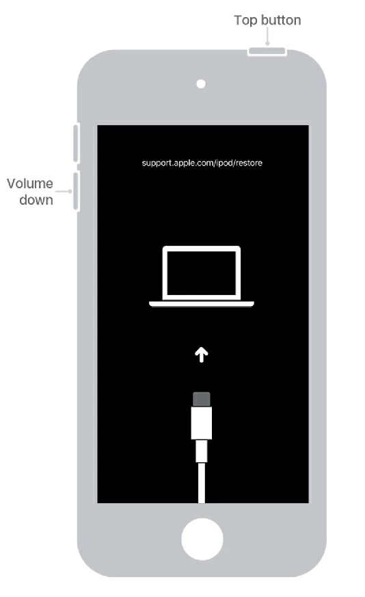 2. 按住顶部按钮,直到看到电源关闭滑块。向右滑动滑块即可关闭 iPod touch。然后使用 USB 连接线将 iPod touch 连接到电脑,同时按下音量调低按钮(第 7 代)或主页按钮(第 6 代或更早版本)。仅当您看到电缆指向计算机或 iTunes 图标后才松开按钮。这意味着您处于恢复模式。