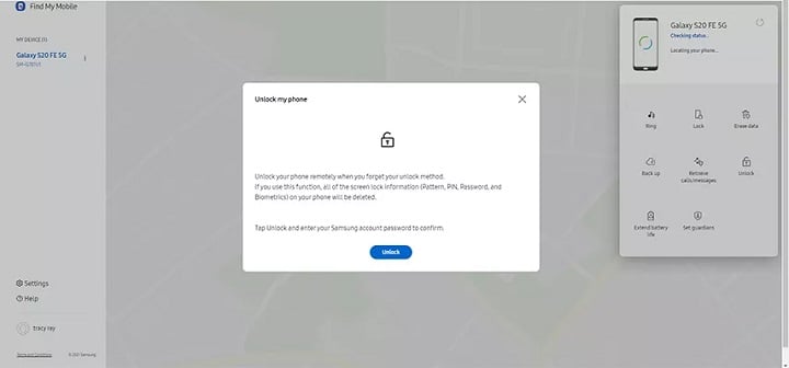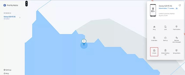 步骤2:然后单击“查找我的手机”选项,然后单击锁定的三星手机。从列表中选择“解锁”。