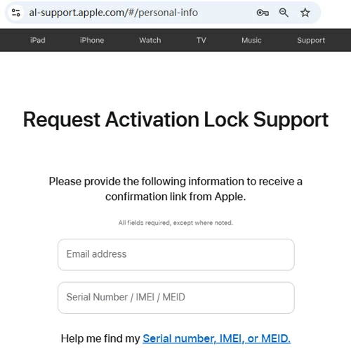 如果您获得的 iPad 当前已使用激活锁锁定,但不幸的是,由于该人不在场,您无法访问用于激活它的原始 Apple ID 和密码,请尝试在线联系 Apple 支持并提出激活锁请求,以便在没有 Apple ID 的情况下解锁 iPad。您需要提供所有权文件来证明您是平板电脑的所有者,包括序列号、IMEI 或 MEID。