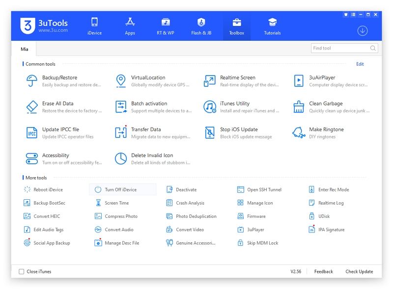 3uTools 是一款专为 iOS 设备开发的一体化解决方案。该工具最适合用于数据管理、越狱和刷新您的 iPhone。此外,它还可以作为绕过备份、激活锁和MDM锁的辅助工具。