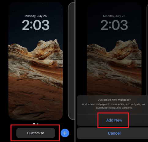 屏幕上将出现“自定义”选项;点击它可打开锁定屏幕的自定义选项。接下来,在锁定屏幕的右下角,点击“+”,它将打开壁纸库,您可以在其中选择锁定屏幕的壁纸。