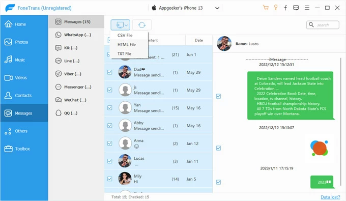 4. 如果您需要在PC上获取iPhone文本,请通过单击导出导出到计算机按钮(显示为计算机图标),然后选择保存为 CSV、HTML 或 TXT 文件。