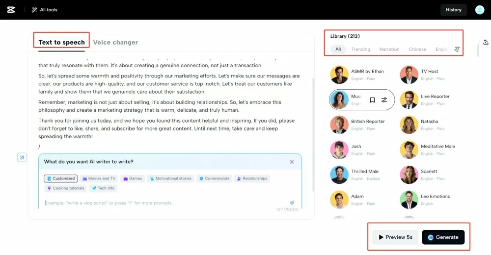 除了变声器之外,女性企业家的另一个宝贵工具是文字转语音免费特征。这种人工智能驱动的功能允许用户将书面内容转换为自然的语音,使其非常适合视频旁白、客户支持和辅助功能增强。