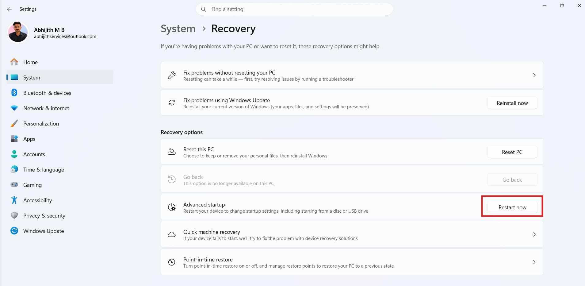 要测试时间点还原,您需要进入 WinRE。为此,请转到“设置”>“系统”>“恢复”>“高级启动”。单击立即重新启动。