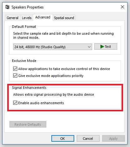 如果您无法找到增强选项卡或所需的选项,则您的音频设备或驱动程序可能不支持这些功能。