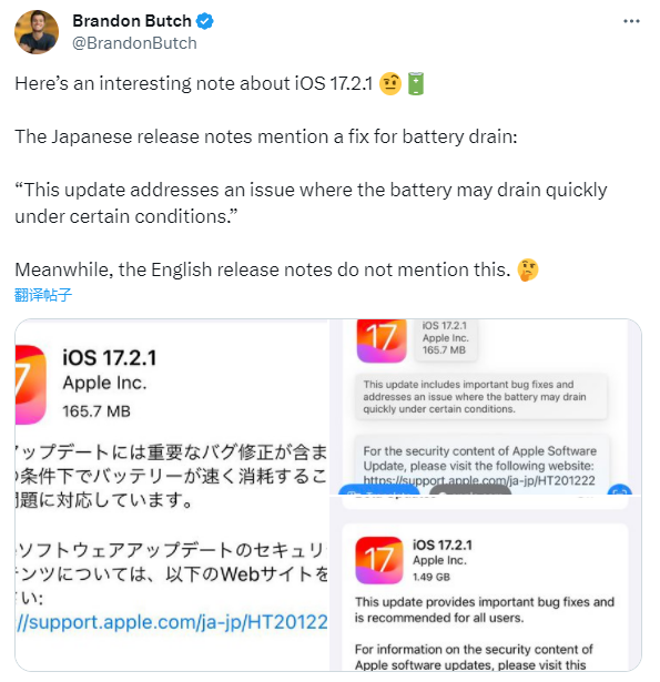 根据X我们发现,在美国和许多其他国家,iOS 17.2.1 的发行说明仅强调“重大错误修复”,而没有指定更多细节。相反,在中国和日本,说明明确提到该更新解决了在特定情况下导致电池加速耗尽的问题。此信息是从文本的计算机翻译中收集的。