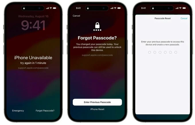 自 iOS 17 起,Apple 提供了密码重置功能,允许您在 72 小时内使用之前的密码暂时解锁不可用的 iPhone。如果您最近更改了密码但忘记了新密码,则可以使用旧密码绕过 iPhone 17 不可用屏幕并立即设置新的解锁码。