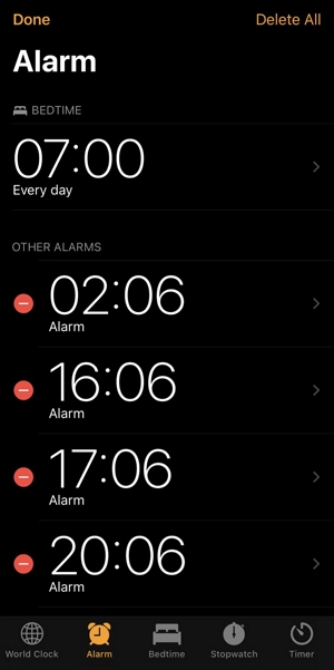 要进行检查,请打开“时钟”应用程序,然后点击“闹钟”选项卡。然后,您可以向左滑动以删除闹钟,或点击“编辑”,然后点击出现的红色减号以找到“删除”按钮。