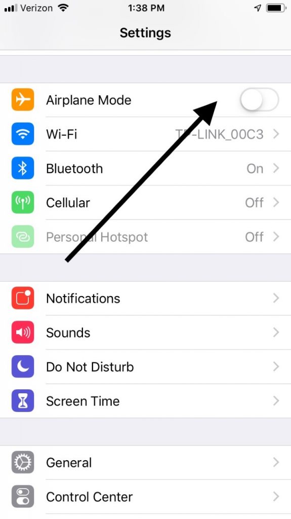 如果您有iPhone X或更近的型号,则必须从屏幕的右上角向下滑动。你也可以去设置, 然后飞机模式,然后在开关上切换。