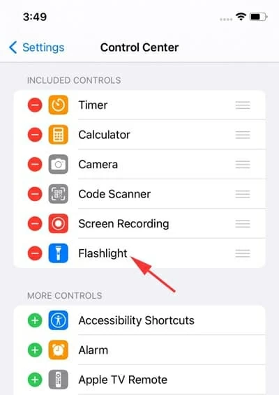 硬重置并且 iPhone 重新打开后,前往控制中心移除手电筒并将其重新添加。