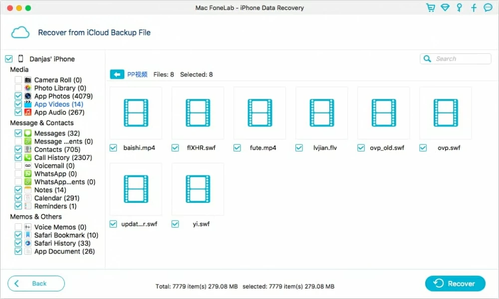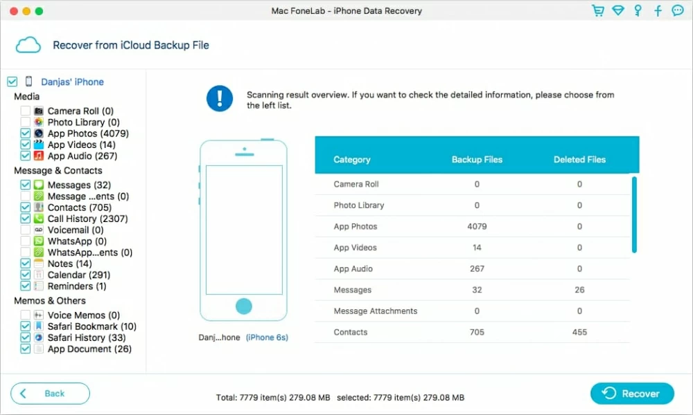 该软件将在左侧显示所有可用数据:相机胶卷、照片库、应用程序照片、应用程序视频、应用程序音频、消息、消息附件、联系人、通话记录、语音邮件、Whatsapp、Whatsapp附件、笔记、日历、提醒、Safari书签、Safari历史记录和应用程序文档。