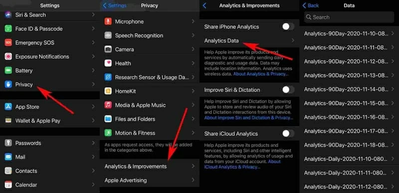 如果您不确定哪个应用程序导致 iPhone 不断意外重新启动,请转到“设置”>“隐私”>“分析和改进”(或早期 iOS 版本中的“分析”)>“分析数据”。当您看到设备的性能统计信息列表时,请向下滚动查看。如果某个应用程序多次出现在列表中,则该应用程序可能出现问题,需要删除。