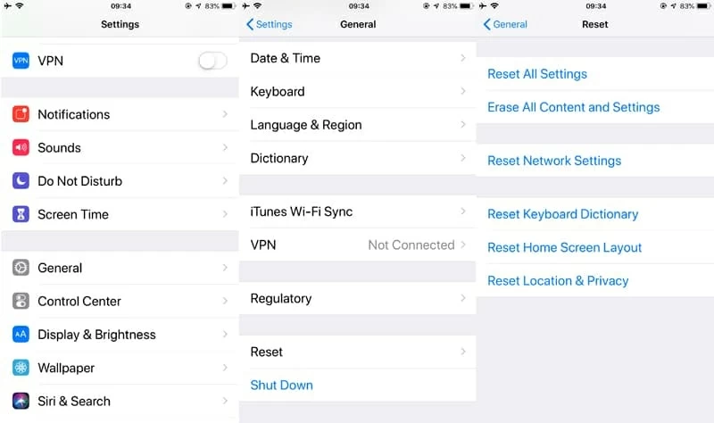iPhone 不断地开关机可能是由于系统设置损坏造成的。苹果有其内置的补救措施,即“重置所有设置”选项。转至“设置”>“常规”>“重置”,然后选择“重置所有设置”。然后,输入密码并再次点击重置所有设置进行确认。